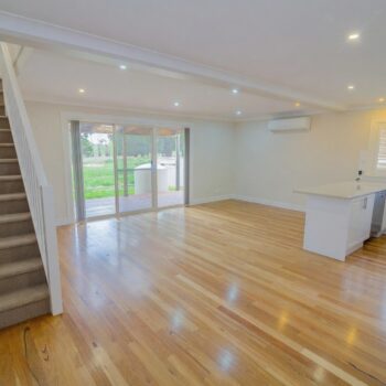 Open-plan living and dining with polished floorboards