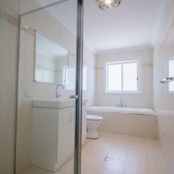 Two modern bathrooms including one with full-sized bathtub